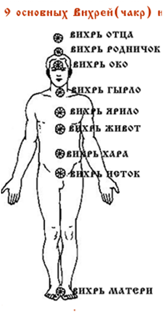 Osoba wymienia energię ze Światem Subtelnym za pomocą ośrodków informacji energetycznej, które w tradycji indyjskiej nazywane są czakrami. Istnieje dziewięć głównych wirów. Każdy z nich służy jako rodzaj anteny do odbioru i przesyłania subtelnej energii o określonej częstotliwości wibracji. Istnienie i cel wirów było znane już kilka tysięcy lat temu. Dziś ich istnienie zostało potwierdzone przez naukę. Jak udowodniła fizyka, każdy obracający się obiekt od Galaktyki do elektronu wytwarza pole skrętne w otaczającej go fizycznej próżni. Każda komórka ludzkiego ciała wytwarza również własne pole skrętne. Komórki stykając się ze sobą tworzą wspólne pole skrętne, które niczym magnes przyciąga je i orientuje w określonym położeniu w przestrzeni, tworząc unikalną kombinację komórek. Organizm ludzki wytwarza także własne pole skrętne, które jest nośnikiem informacji dla organizmu jako całości i jego komórek o budowie, funkcjonowaniu i stanie świata wewnętrznego i zewnętrznego.