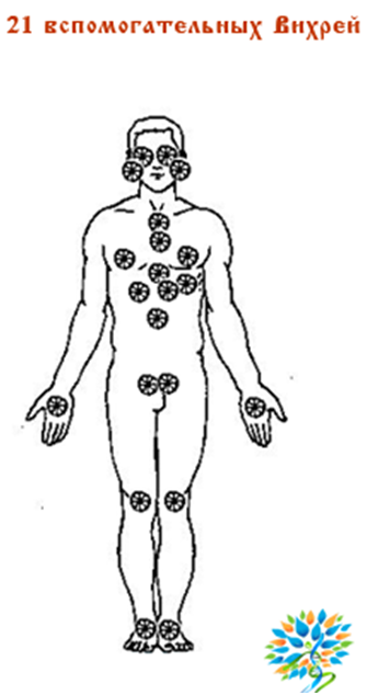 Położenie dziewięciu głównych wirów na ciele człowieka odpowiada w przybliżeniu lokalizacji dużych splotów nerwowych w odpowiednich obszarach ciała fizycznego.