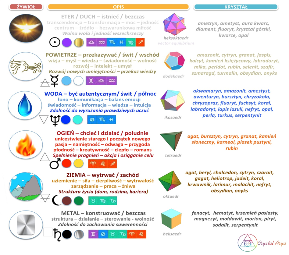 Kolory, kształty i kryształy posiadają energetyczny zapis właściwości danego żywiołu w siatce krystalicznej. Wspierają pracę z energią (medycyna wibracyjna) i mogą być wykorzystywane jako wsparcie w aktywacji tam, gdzie jest nadmiar lub niedobór danego żywiołu. Do zastosowania kolorów, kształtów i kryształów w celu niwelowania oraz harmonizacji nadmiaru, warto poznać zasadę 5 przemian (który żywioł kontroluje inny żywioł).