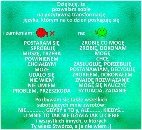 | Nie mogę…….. | Musisz postarać się i spróbować…… | Utwierdzanie, że można tylko próbować, to pogłębianie lęków i braku wiary w siebie |
