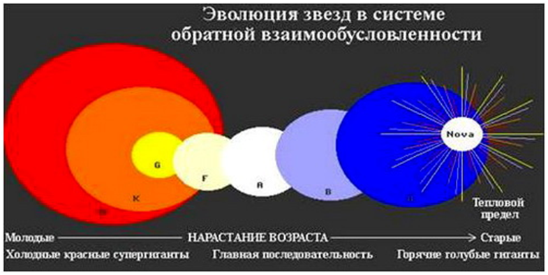 – gwiazdy powstają jako ogromne obłoki pyłu, kondensują się w czerwone nadolbrzymy, pomarańczowe olbrzymy, żółte gwiazdy, białe gwiazdy ciągu głównego, następnie wyrastają na niebieskie olbrzymy, a następnie w supernowe. Podobny proces zachodzi podczas podgrzewania metalu, od czerwonego blasku do błękitu i zniszczenia.