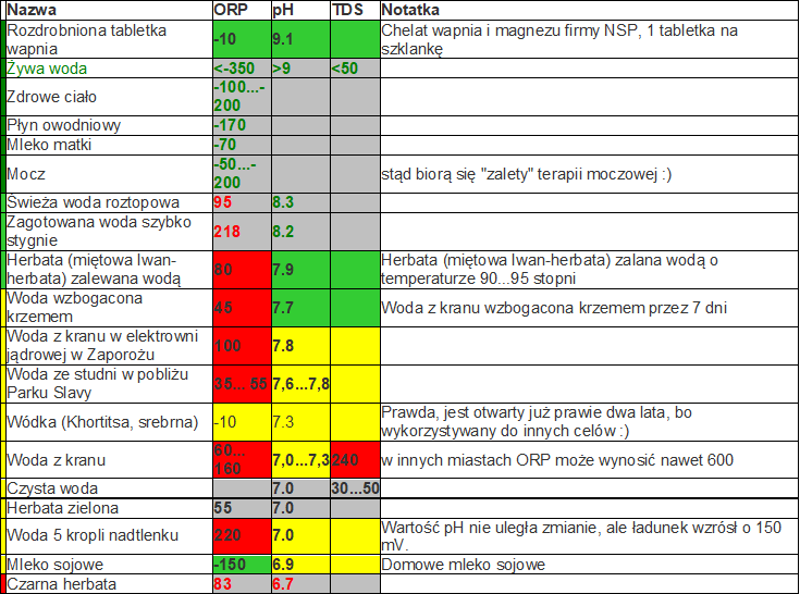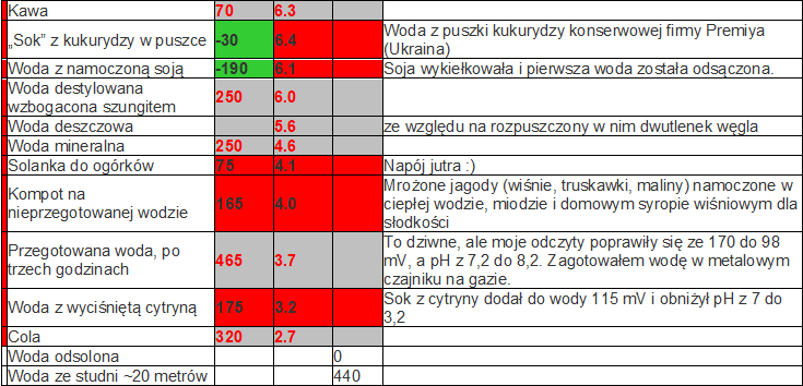 Jak widać, potencjał ORP wody roztopowej jest dodatni, co oznacza, że jest to nadal woda martwa. Jego zaletą jest wysokie pH oraz brak zanieczyszczeń i substancji szkodliwych. Może wydawać się zaskakujące, że przegotowana, a nawet zwykła woda z kranu, jest zdrowsza niż herbata. Herbata nieznacznie podnosi ORP, ale znacząco obniża pH, co niweczy jej „przydatność”.