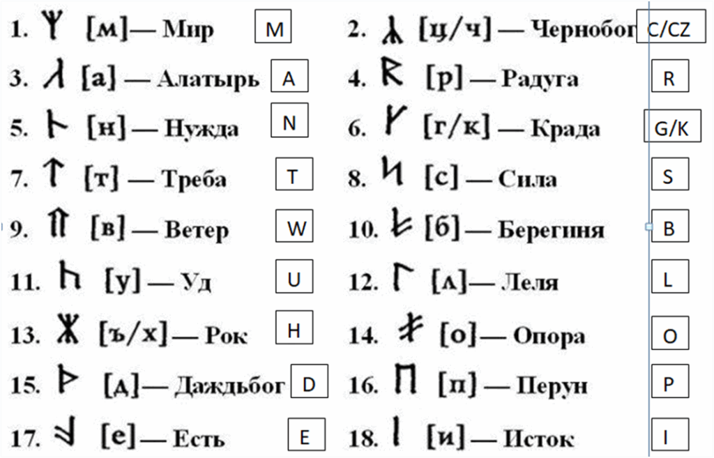 Obecnie znanych jest 18 słowiańskich run. Uznawano je za podstawę i wykorzystywano w różnych dziedzinach życia. Nakładano je na przedmioty gospodarstwa domowego i wykorzystywano w czynnościach rytualnych. Znaczenie starożytnych słowiańskich run jest łatwe do zrozumienia nawet dla współczesnych ludzi, ponieważ nazwy znaków w większości przypadków odpowiadają imionam Bogów ( Czarnobog , Perun , Lelya itp.). Ale jest w nich także ukryte znaczenie. Runy to kultowe generatory amuletów. System oszczędzania, którego używali nasi przodkowie, jego symbole są utkane ze specjalnej energetyczno-informacyjnej przestrzeni Ducha, która rozwinęła się wśród słowiańskiej społeczności narodów.