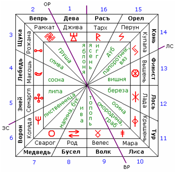 16. Ras to święty biały lampart lub, jak mówią, biały pard (pardus), a ryś jest jedną z odmian. Patron – Tarkh (Dazhdbog – dawanie Boga). Legendy mówią, że podczas swojej pierwszej wizyty Tarkh sprowadził rodzinę kotów z Ingard-Earth do Midgard-Earth. Święte drzewo – jesion, igg . Dla Skandynawów Drzewem Uniwersalnym jest Yggdrasil (Igg to rodzaj popiołu, Dra to drzewo, Sil to Uniwersał).