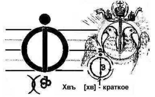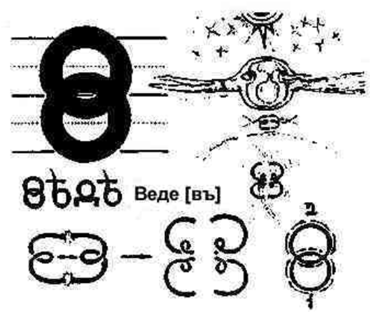 „Vede” to Znak nieskończonej Jedności „Przestrzeni i Firmamentu”, czyli: POPRZEZ KREATYWNE KONFAKTORIZACJE. Znak Czasu (-w poziomie) „Gwiezdnego płonącego slo; Znak Twórcy Czasu (-w pionie) w czasach ВитоХороИдации. Dwa okrągłe, zamknięte strumienie informacji o energii (EI), górny i dolny, ziemski i niebiański, przecinają się w dwóch punktach. Dwa Światy, duchowy i materialny, przenikają się wzajemnie, a penetracja ta dokonuje się na poziomie Duszy.