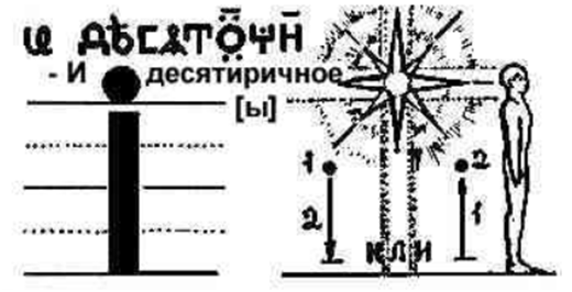 Bukowa Iże „I” – W Słowie Auro-Stworzenia Słońca Ra wznoszenia się człowieka poprzez „Nasienie Drzewa Myśli”… Z grafiki Izhe jasno wynika, że przepływ EI jest swego rodzaju jego elementarną sekcją wyciętą z cewki Svetovit. Bukova Izhe jest pisana od lewej do prawej, od przeszłości do przyszłości. Oznacza to, że w człowieku istnieją jednocześnie trzy razy.