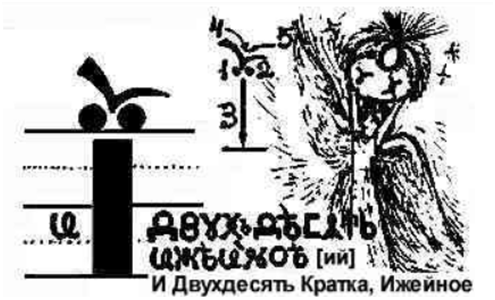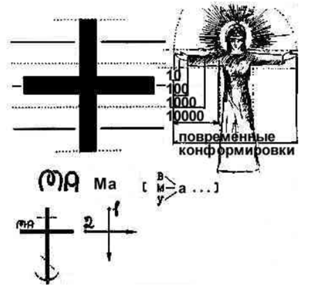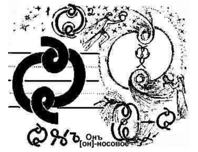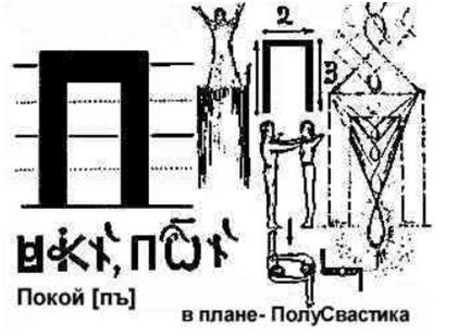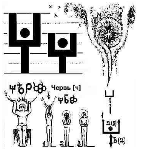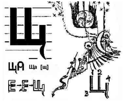 W tym buku ! Przecinek umieszczony jest do góry nogami i symbolizuje pokolenie ludzi, którzy opuścili ziemski plan, ludzi, którzy zmarli. Przeplata się z literą UK – УК , oznaczającą ducha człowieka, skierowanego ku ziemi, czyli wcielonego.